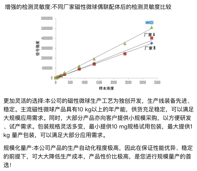 在磁場作用下可以迅速遷移,磁場撤除后無剩磁,能很快重新分散。磁性部分之外包裹一層聚合物,將磁顆粒完全封閉在微球內部。最后在表面修飾一層特殊親水材料(同樣應用于本公司所有磁性微球類產品),賦予微球親水性、極佳的懸浮穩定性。可如液體一般進行取用,操作方便,可適應不同的緩沖溶液和酸堿環境。規整的球形形貌,可將非特異性吸附作用降至最低,并降低微球團聚的風險。