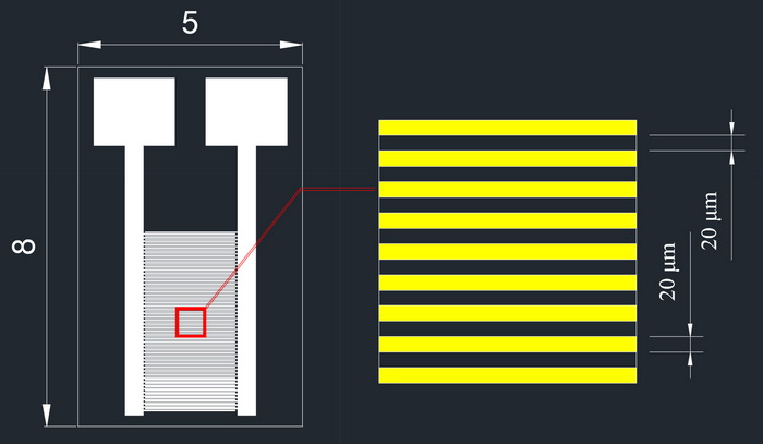 我們提供各種叉指電極,包括不同形狀,不同尺寸,不同線寬線距,不同基材(氧化鋁陶瓷,PI/PET柔性材料,單晶硅),不同工藝(厚膜工藝,PCB工藝,MEMS工藝)。