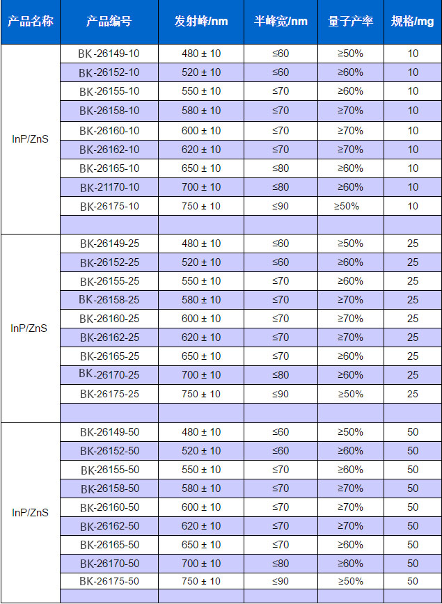 蘇州北科納米科技有限公司生產的油溶性InP/ZnS量子點產品是以InP為核心,ZnS為殼層,表面由疏水配體包裹的核/殼型熒光納米材料,平均的量子產率為60%,儲存時應避免陽光直射,4度密封暗處保存,可以為客戶訂制生產490nm~750nm任一波長不同克數的產品。本產品具有粒徑均一,吸收光譜寬泛,發射光譜窄而對稱,熒光強度高而穩定等特點,