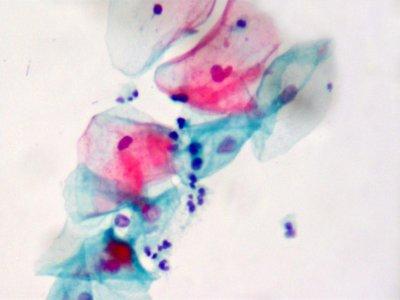 【染色結(jié)果】胞核染紫藍色;鱗狀上皮基底層、中層及表層角化前細胞胞質(zhì)染綠色,表層不完全角化細胞胞質(zhì)染粉紅色,完全角化細胞胞質(zhì)呈桔黃色;中性粒細胞和淋巴細胞、吞噬細胞胞質(zhì)均為藍色;紅細胞染粉紅色,粘液染淡藍色或粉紅色。高分化鱗癌細胞可染成粉紅色或桔黃色;腺癌胞質(zhì)呈灰藍色。