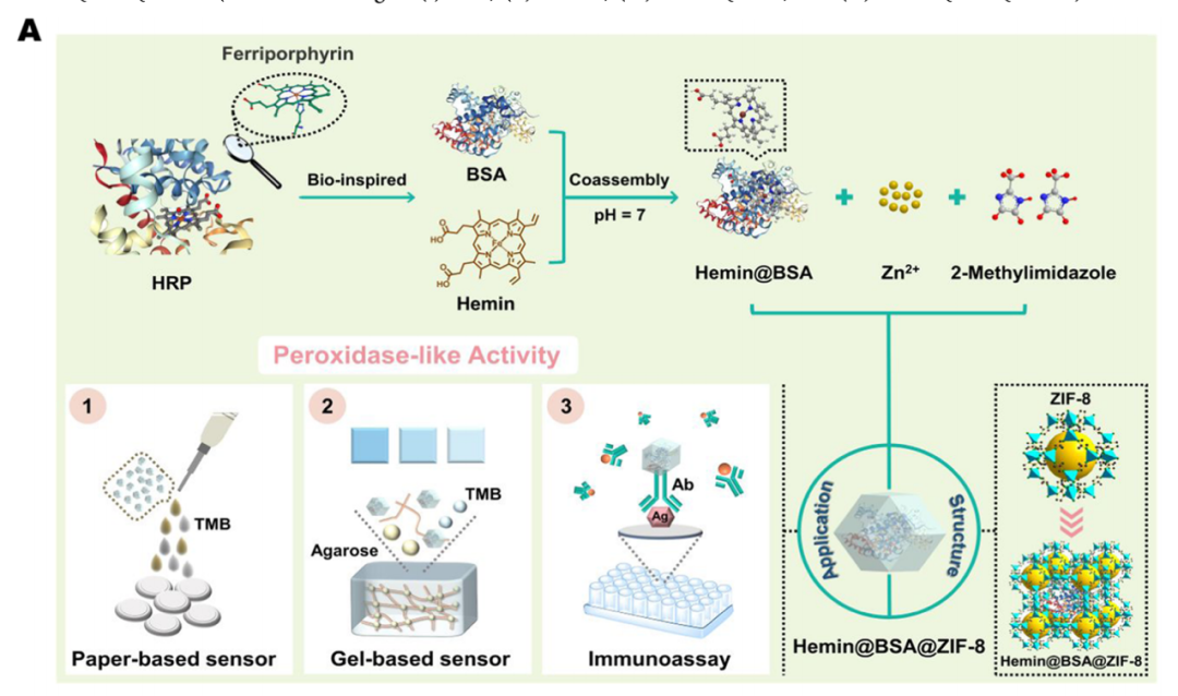 【主要優勢】1、Hemin@BSA的結構類似于辣根過氧化物酶(HRP),其中BSA像口袋一樣包住作為活性輔因子的血紅素,同時為底物構建一個疏水的空間;2、由于限域效應,有多孔內腔的ZIF-8被看作是Hemin@BSA的理想外層,不僅可以加速底物的反應,而且可以顯著增強其類過氧化氫酶的活性;3、用ZIF-8包裹Hemin@BSA可以通過快速結晶形成一層保護殼來防止Hemin@BSA在惡劣中的分解。