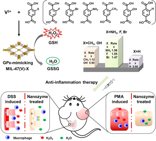 【主要優勢】1、MIL-47(V)-NH2 MOF納米酶不僅具有良好的生物相容性,還是一種有效的ROS清除劑,可保護細胞免受氧化損傷;2、類GPx的MIL-47(V)-NH2納米酶對耳部炎癥和腸炎的廣譜抗炎作用;3、高活性MIL-47(V)-NH2的治療效果優于低活性MIL-47(V)-H。