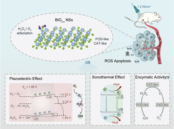 Oxygen-Vacancy-Rich Piezoelectric BiO2−x Nanosheets for Augmented Piezocatalytic, Sonothermal, and Enzymatic Therapies