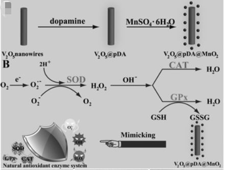 1、V2O5@pDA@MnO2納米復(fù)合材料可以作為一種多納米酶模型來(lái)模擬細(xì)胞內(nèi)基于抗氧化酶的防御過(guò)程,其中SOD、CAT和GPx共同參與;