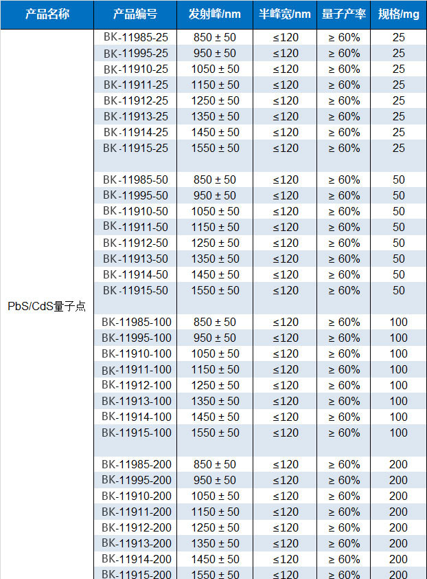 蘇州北科納米科技有限公司生產的油溶性PbS量子點產品,表面由疏水配體包覆,平均的量子產率為50%,儲存時應避免陽光直射,4度密封暗處保存,可以為客戶訂制生產800nm~1600nm任一波長不同克數的產品。本產品具有粒徑均一,吸收光譜寬泛,發射光譜窄而對稱,熒光強度高而穩定等特點,可應用于電子通訊、液晶顯示屏、發光二極管、太陽能電池、生物熒光標記等領域。