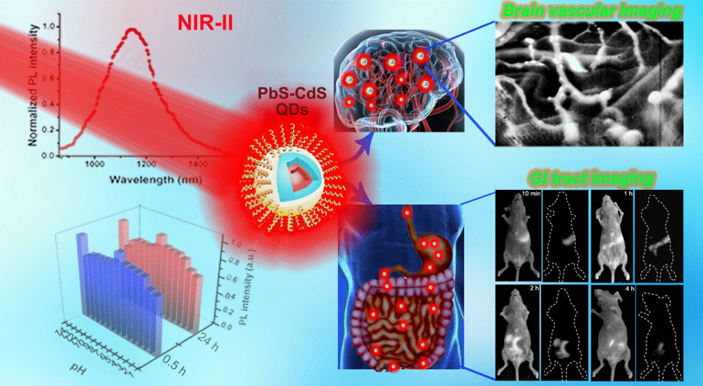 利用近紅外二區熒光成像技術實現了對活體小鼠腦部血管和胃腸道的造影。在該工作中,該課題組用一種在近紅外二區(NIR-II, 1000-1700nm)波段發光很強的PbS@CdS量子點(量子產率為60%)經雙層包覆的形成發光很強的PbS@CdS@SiO2@F-127納米顆粒,同時該納米顆粒還具備了非常好的pH穩定性和生物兼容性。課題組將PbS@CdS@SiO2@F-127納米顆粒經尾靜脈注射到小鼠體內,用785nm波長(位于近紅外一區)的激光激發小鼠腦血管實現顯微成像,觀察到了深層腦部血管的清晰結構,成像深度可達950μm。同時,課題組還將微量(80μg/kg)PbS@CdS@SiO2@F-127納米顆粒注入到小鼠體內,利用近紅外二區熒光成像技術實現了小鼠胃腸道的造影,觀測到了高信噪比的胃腸道結構。該文章發表在由德國化學協會(Wiley)主辦的2017年最新一期Advanced Functional Materials上,該雜志2016年影響因子為12.1,屬于中科院JCR期刊一區,是納米功能材料領域的權威。本項研究為生產高效率高穩定量子點熒光造影劑提供了一種新型技術指導方案。