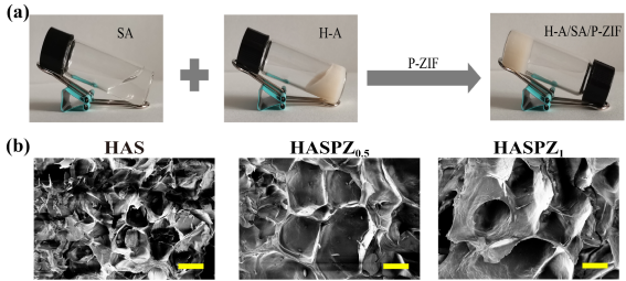 其他說明:密封狀態下保質期半年【主要優勢】通過將聚六亞甲基雙胍(PHMB)負載到 ZIF-8 納米粒子的框架中來獲得 pH 響應性抗菌 P-ZIF(ZIF:沸石咪唑酯框架)。這將使 PHMB 能夠在受感染傷口的弱酸環境中釋放。為了解決燒傷感染問題,將 P-ZIF 納米粒子通過硼酸酯鍵加載到由海藻酸鈉 (SA) 和 3-氨基苯硼酸修飾的類人膠原蛋白 (H-A) 制成的水凝膠系統中