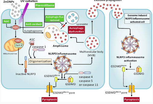 Skin damage induced by zinc oxide nanoparticles combined with UVB is mediated by activating cell pyroptosis via the NLRP3 inflammasome–autophagy–exosomal pathway