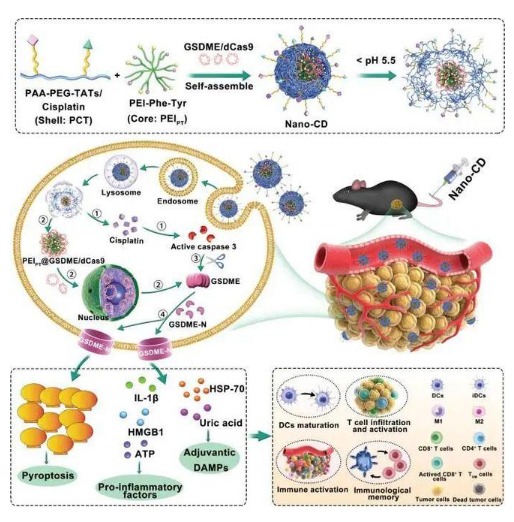 其他說明:密封狀態下保質期半年【主要優勢】Nano-CD利用從功能篩選中選擇的特定sgRNA觸發內源性GDSME表達,同時釋放順鉑啟動免疫細胞死亡。此外其可以聯合檢查點阻斷可產生持久的免疫記憶和強大的全身抗腫瘤免疫反應,從而預防疾病復發,抑制肺轉移,提高小鼠黑色素瘤的生存率。