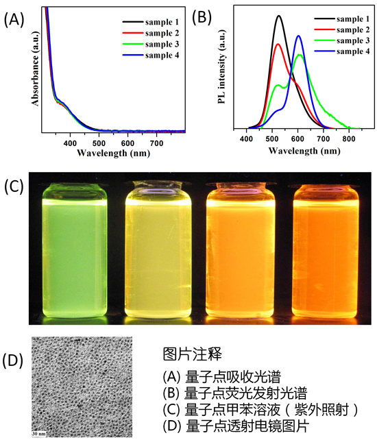 蘇州北科納米科技有限公司生產的油溶性Cu,Mn共摻雜量子點產品,平均的量子產率為50%,儲存時應避免陽光直射,4度密封暗處保存。本產品具有粒徑均一,吸收光譜寬泛,發射光譜對稱,熒光強度高而穩定等特點,特別適于用作量子點電視背光系統中的光轉換材料,與藍光芯片組合白光后顯色指數高達95以上,也適用于太陽能電池與生物熒光標記等領域。 本產品為無鎘量子點。