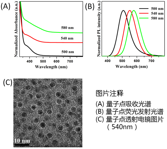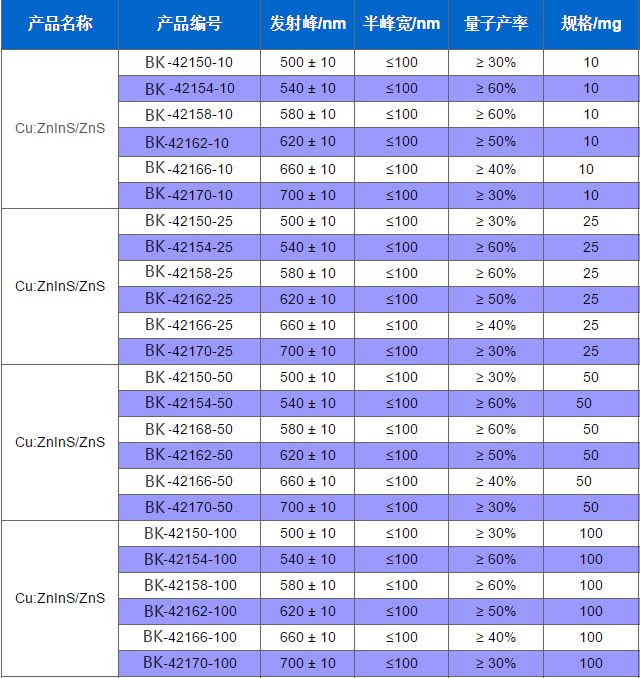 蘇州北科納米科技有限公司生產的油溶性Cu摻雜ZnInS 量子點產品,平均的量子產率為50%,儲存時應避免陽光直射,4度密封暗處保存,可以為客戶訂制生產500nm~700nm任一波長不同克數的產品。本產品具有粒徑均一,吸收光譜寬泛,發射光譜對稱,熒光強度高而穩定等特點,可應用于太陽能電池、發光器件與生物熒光標記等領域。 本產品為無鎘量子點。