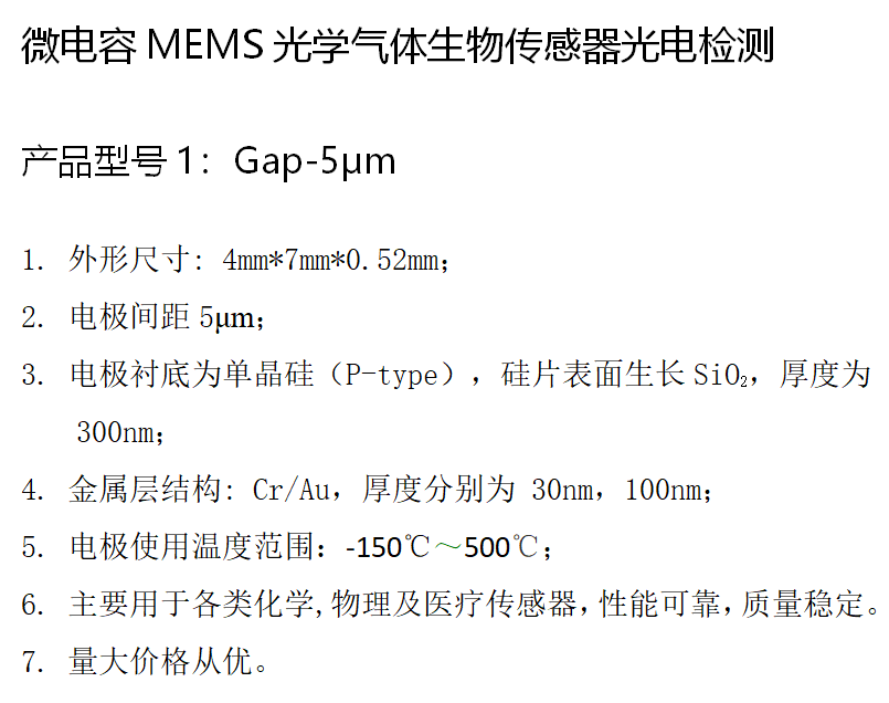 Microcapacitance interdigital gold electrode MEMS optical gas biosensor photoelectric detection single electrode