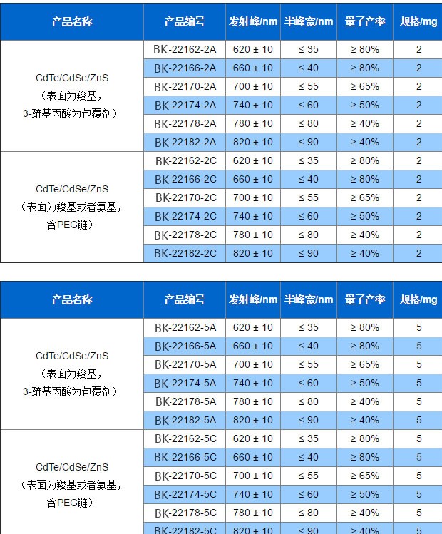 The company currently provides four types of water-soluble CdTe/CdSe/ZnS quantum dots: (1) negatively charged carboxyl groups on the surface, 3-mercaptopropionic acid as a coating agent; (2) negatively charged carboxyl groups on the surface, and polymers as Coating agent; (3) The surface is negatively charged carboxyl group, containing PEG chain, which has excellent biocompatibility and can be connected to antibody proteins with amino groups; (4) The surface is positively charged amino group, containing PEG chain, biological phase It has excellent capacity and can be connected to antibody proteins with carboxyl groups.