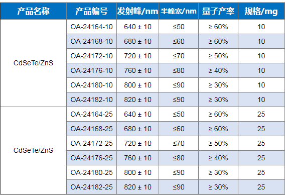 油溶性CdSeTe/ZnS量子點產(chǎn)品是以CdSeTe為核心,ZnS為殼層,表面由疏水配體包裹的核/殼型熒光納米材料,平均的量子產(chǎn)率為50%,儲存時應(yīng)避免陽光直射,4度密封暗處保存,可以為客戶訂制生產(chǎn)640nm~820nm任一波長不同克數(shù)的產(chǎn)品。本產(chǎn)品具有粒徑均一,吸收光譜寬泛,發(fā)射光譜對稱,熒光強度高而穩(wěn)定等特點,可應(yīng)用于太陽能電池、發(fā)光器件與生物熒光標(biāo)記等領(lǐng)域