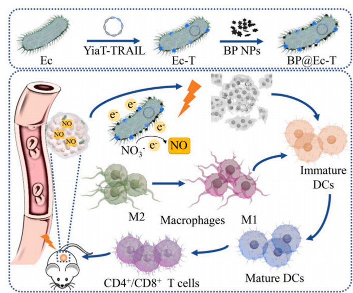 Other instructions: Half shelf life in sealed state [Main advantage] The bacterium expresses tumor necrosis factor-related apoptosis-induced ligand (TRAIL) through the outer membrane YiaT protein (Ec-T). It can transfer the photoelectrons generated by BP NPs after laser irradiation and trigger the nitrate reduction metabolism of nitric oxide, released in situ at the tumor site, promoting the therapeutic effect and polarization of tumor-associated macrophages to the M1 phenotype. Meanwhile, the production of reactive oxygen species induces immunogenic cell death, further enhancing its antitumor efficacy.