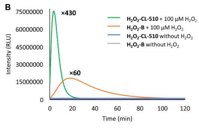 Other instructions: shelf life of half a year in sealed state [Main advantages] H2O2-cl-510 is a probe with high selectivity and sensitivity used for H2O2 in vitro and in vivo. In the absence of any laser excitation, H2O2 directly triggered a 430-fold higher chemiluminescence enhancement. The oxidative damage of arsenic trioxide to leukemia was successfully detected. Visualization of the H2O2 flux induced by the cerebral ischemia-reperfusion injury in rats provides a new chemical tool for real-time monitoring of H2O2 dynamics in living animals.