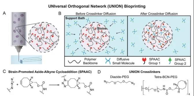為了實現更大的生物墨水多樣性,需要新的交聯策略。為了避免生物墨水在成型過程中產生不利于細胞存活的生物化學刺激。開發的通用生物墨水家族必須滿足以下條件:(1)使用細胞兼容的適用多種聚合物交聯方法;(2)可以聚合生成大分子結構;(3)對多種支撐浴都可以通用;(4)對多種細胞類型可進行生物化學和機械性能定制。