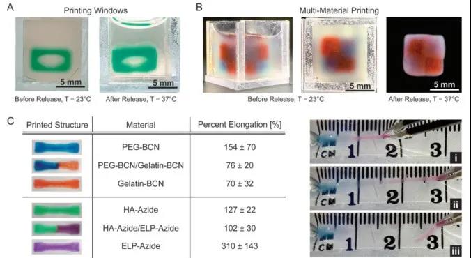 文章主要采用凝膠懸浮浴的方式進行打印,剪切變稀的凝膠支撐材料中混入了交聯劑,擠出噴頭伸入液面以下擠出的生物墨水構建3D結構,同時交聯劑小分子就開始向生物墨水中擴散,并同時發生SPAAC反應,最后通過交聯固化,得到完整的三維實體水凝膠結構。文章應用該方法打印了窗口結構、多材料方塊以及多材料拉伸結構。