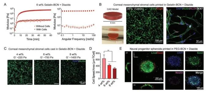 此外,通用生物墨水系統適應性的關鍵是其定制能力,以匹配所需的生物打印應用。故研究者還根據不同細胞種類的基質力學性能構建細胞培養的支架,驗證了角膜基質細胞、神經前體細胞等在生物墨水材料內依然保持有良好的存活性和功能表達性。證明生物正交交聯生物墨水與其他生物分子沒有交叉反應,包括存在于細胞表面、培養基或墨水本身的生物分子,這使其成為一種通用策略。