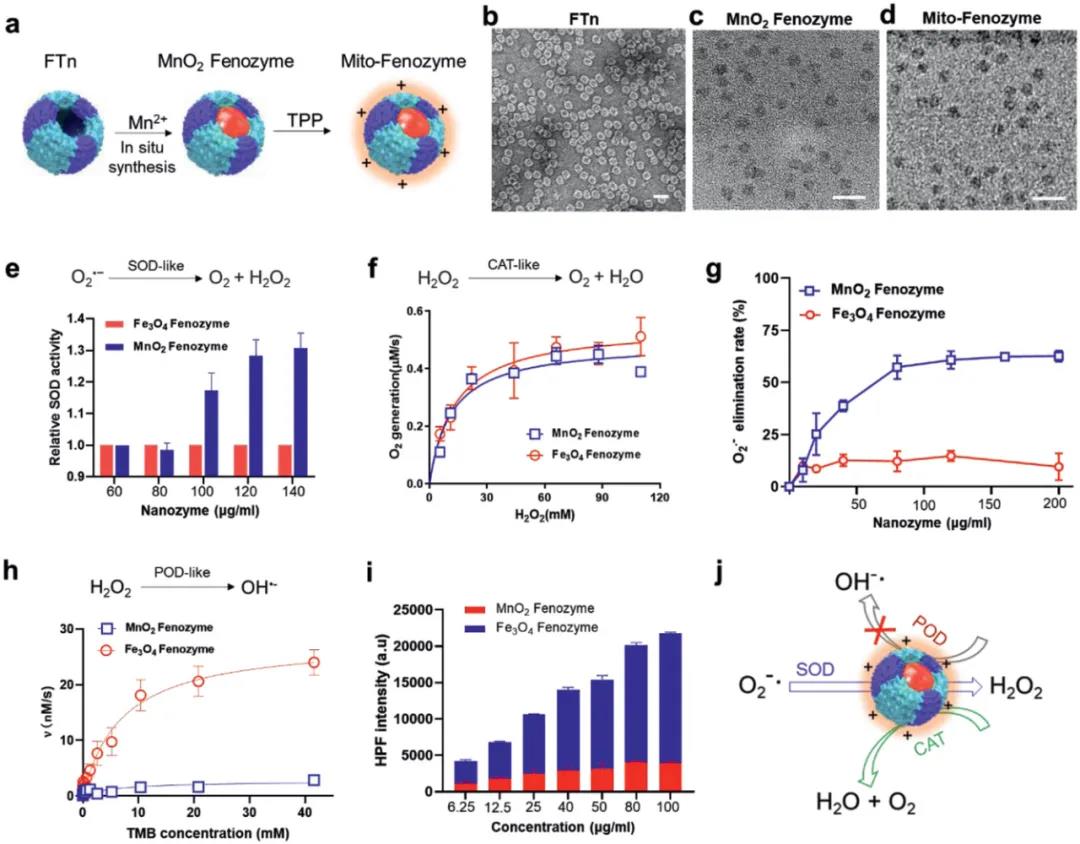 (1)這些納米酶以鐵蛋白重鏈基蛋白為酶支架,以金屬納米顆粒為酶活性中心,其具有超氧化物歧化酶和類過氧化氫酶的活性,并能通過克服多種生物屏障來靶向線粒體。