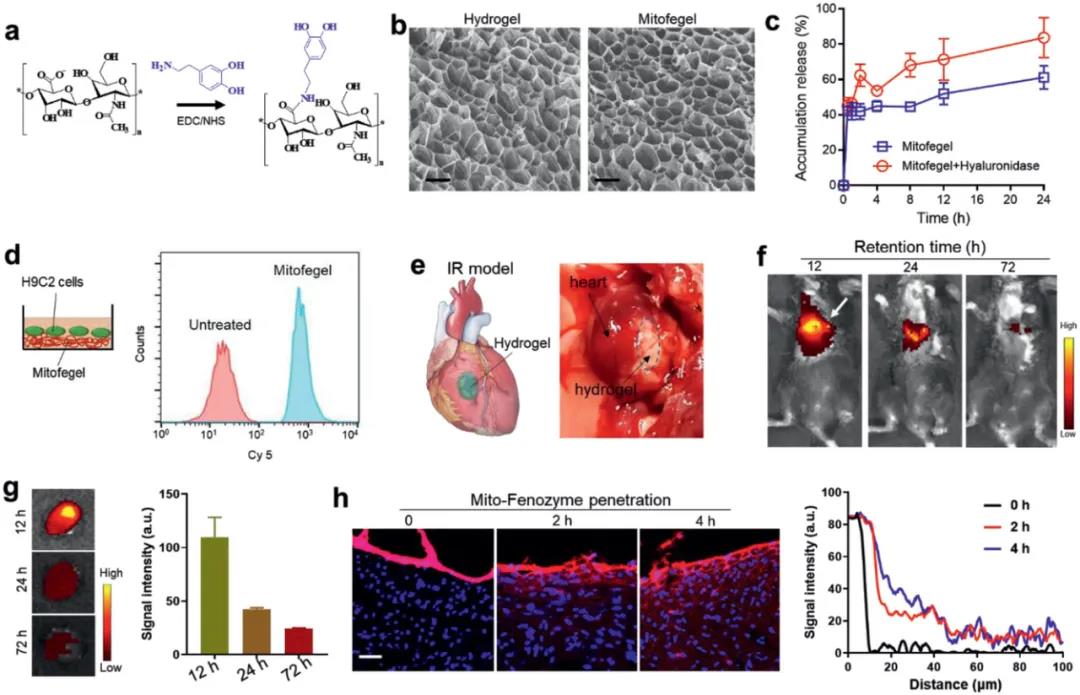 (2)在心臟缺血-再灌注動物模型中,實驗分別通過全身遞送和局部釋放黏附水凝膠(即心臟貼片)的方式證明了該雜交納米酶可在體內對線粒體氧化損傷和在梗死后心臟功能的恢復過程中發揮保護作用。綜上所述,這一研究充分闡明了模擬酶的從頭設計策略,同時也為緩解氧化損傷提供了一個新型的治療選擇。
