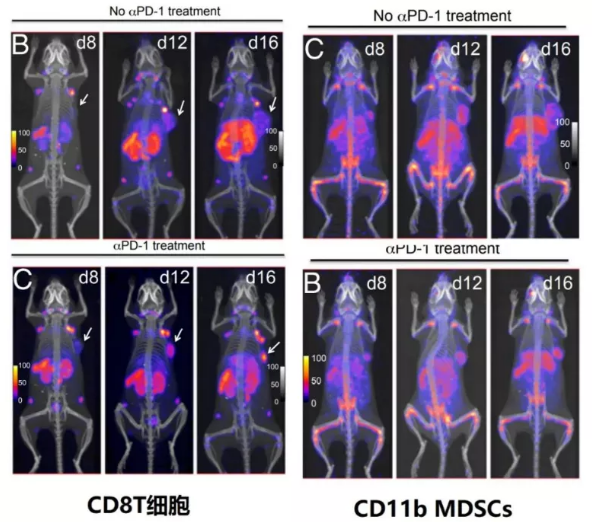 二、納米抗體用于腫瘤影像診斷1、PET(正電子發(fā)射型計(jì)算機(jī)斷層顯像)在PET成像中,同位素標(biāo)記的抗體或者抗體片段被用于體內(nèi)標(biāo)記藥物靶點(diǎn),具有良好的特異性。納米抗體由于分子量小,具有很好的組織穿透性,已被用于評(píng)估患者藥物靶點(diǎn)分布以及腫瘤微環(huán)境研究。68/67Ga或89Zr標(biāo)記的EGFR抗體7D12是第一個(gè)在PET中使用的納米抗體,顯示出良好的腫瘤背景差。2016年68Ga標(biāo)記的HER納米抗體被用于乳腺癌HER2表達(dá)的評(píng)估[5],之后還陸續(xù)開展了兩個(gè)Ⅱ期臨床試驗(yàn)。腫瘤微環(huán)境中的髓系抑制細(xì)胞(MDSCs)是重要的免疫治療耐藥因素之一。在小鼠模型,89Zr標(biāo)記的納米抗體被用于 PET分析PD-1阻斷治療前后CD8+T細(xì)胞和CD11b+ MDSCs細(xì)胞的分布[6]。