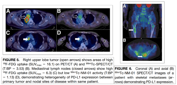 SPECT成像應(yīng)用伽馬發(fā)射的放射性同位素,使用99mTc標(biāo)記納米抗體,可以在臨床檢測(cè)藥物靶點(diǎn)的分布情況,作為用藥指導(dǎo)。2019年上海第一人民醫(yī)院核醫(yī)學(xué)科與倫敦國(guó)王學(xué)院的聯(lián)合研究使用99mTc標(biāo)記的PD-L1單域抗體評(píng)估PD-L1在非小細(xì)胞肺癌患者體內(nèi)表達(dá),為免疫檢查點(diǎn)抗體治療提供基礎(chǔ)。