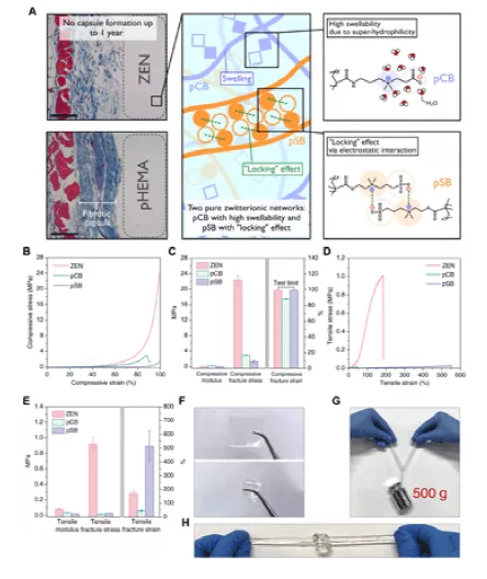 高機械強度和對纖維囊形成的長期抵抗力是可植入材料的兩個主要挑戰。不幸的是,這兩個不同的屬性并沒有融合在一起,而是相互折中。最近,天津大學Dianyu Dong和華盛頓大學Caroline Tsao,Hsiang-Chieh Hung教授團隊合作通過“溶脹”和“鎖定”機制將兩種弱性兩性離子水凝膠整合到類似彈性體的高強度純兩性離子水凝膠中,從而報告了獨特的材料類別。相關論文題為High-strength and fibrous capsule–resistant zwitterionic elastomers發表在《ScienceAdvances》上。這些兩性離子-彈性體-網絡化(ZEN)水凝膠進一步顯示,在植入小鼠體內長達1年后能有效抵抗纖維囊的形成。具有高機械性能和長期纖維囊抗性的這種材料以前從未獲得過。這項工作不僅證明了一類耐用且耐纖維的膠囊材料,而且還為兩性離子彈性體水凝膠提供了設計原理。