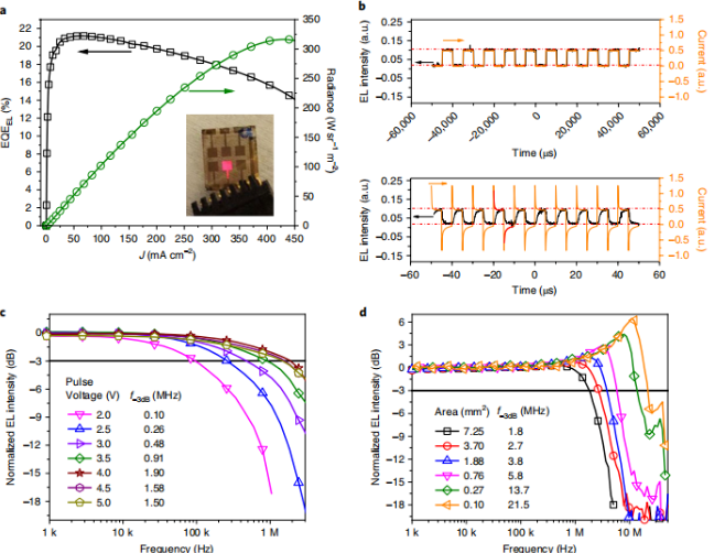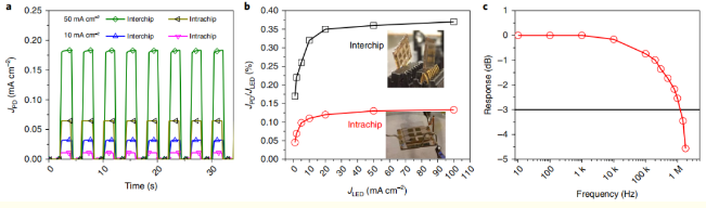 作者已經證明,光信號發射器和接收器功能可以使用金屬鹵化物鈣鈦礦集成到一個器件中?梢酝ㄟ^更改偏置方向來可逆地切換器件的兩個功能。當用作發光或光檢測裝置時,該二極管顯示出與最先進的單功能鈣鈦礦器件相當的高性能。對鈣鈦礦發光器件的響應速度進行了系統的研究,對于0.1mm2的器件,其響應速度約為21MHz。鈣鈦礦二極管對同一個二極管發出的光具有很高的靈敏度,這為簡化光電器件的集成提供了獨特的機會。我們通過構建基于兩個相同的鈣鈦礦二極管的單片脈沖傳感器系統和雙向光通信系統來證明這一點。此外,由于器件主要受寄生電容的限制,我們希望通過減小像素的尺寸可以進一步提高器件的響應速度。這將允許發展高速的顯示器到顯示器的通信或數據交換。這些特性,加上在各種無機襯底上的集成簡便性以及與互補金屬氧化物半導體的兼容性,使得這種雙功能鈣鈦礦二極管有望在未來的溶液處理光電集成電路中用于芯片間或芯片內數據鏈路。