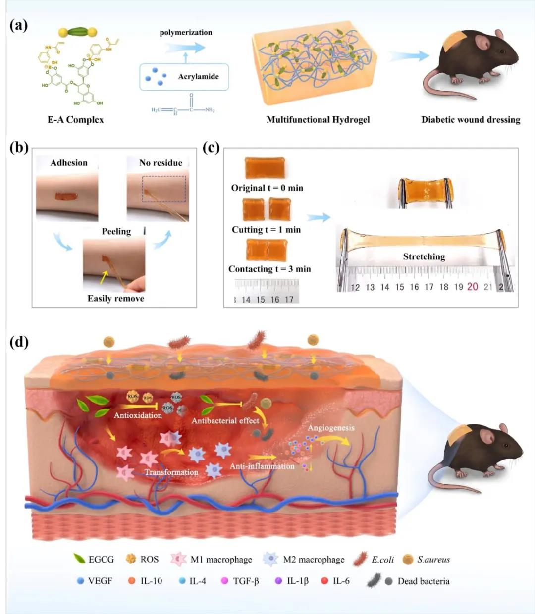 課題組研制出的新型水凝膠傷口敷料具有以下優(yōu)點:一是具有優(yōu)異的力學(xué)性能和快速自修復(fù)功能。通過引入動態(tài)苯硼酸酯鍵,有效避免人體局部運(yùn)動和敷料破裂引起的二次感染;二是具備良好的組織粘接力、抗菌、抗炎和抗氧化功能。相較于商品化敷料膜,引入EGCG的水凝膠體系可以顯著加速傷口閉合,促進(jìn)抗炎因子(IL-4、IL-10)、血管內(nèi)皮生長因子(VEGF)和轉(zhuǎn)化生長因子(TGF-β)表達(dá),加速傷口區(qū)域巨噬細(xì)胞M1-M2轉(zhuǎn)化,抑制促炎因子IL-1β、IL-6表達(dá)。三是大幅提升敷料更換的便捷性,避免造成傷口二次損傷。隨著EGCG的釋放,凝膠體系黏附性降低,敷料可輕易移除。目前,課題組正加速推進(jìn)該新型水凝膠傷口敷料在糖尿病口腔粘膜創(chuàng)傷修復(fù)的應(yīng)用探索。