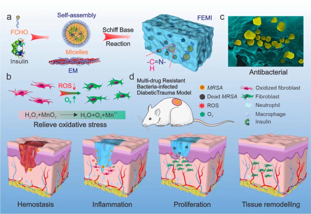 為了應對糖尿病傷口的細菌感染、高氧化及高血糖問題,來自西北工業大學的張秋禹教授團隊開發出一種基于醛基化改性F127膠束/聚賴氨酸包被二氧化錳的可注射水凝膠(FEM水凝膠)。該水凝膠體系中聚賴氨酸具有抗菌性,二氧化錳的還原性用于中和氧化性物質,F127可以包載胰島素用于降低血糖。相關研究論文:Nanoenzyme-Reinforced Injectable Hydrogel for Healing Diabetic Wounds Infected with Multidrug Resistant Bacteria發表于雜志Nano Letters上。