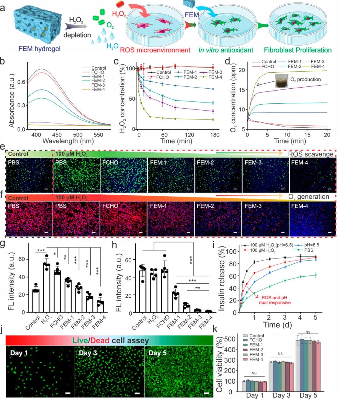 2. FEM敷料具有持續抗菌及消除自由基能力糖尿病患者中升高的葡萄糖參與了ROS的大量產生,這阻礙了傷口的愈合。二氧化錳的加入可有效消除ROS并補充氧氣。與雙氧水對照組相比,與FEM-4水凝膠共孵育的成纖維細胞顯示出顯著更低的綠色熒光,這表明FEM水凝膠可以有效減輕細胞內的氧化應激。(圖3e)研究人員對FEM水凝膠的胰島素釋放行為進行了研究(圖3 。。與對照組相比,在酸性和氧化性條件下,前6小時內胰島素快速釋放,顯示出獨特的pH /氧化還原雙重響應性。
