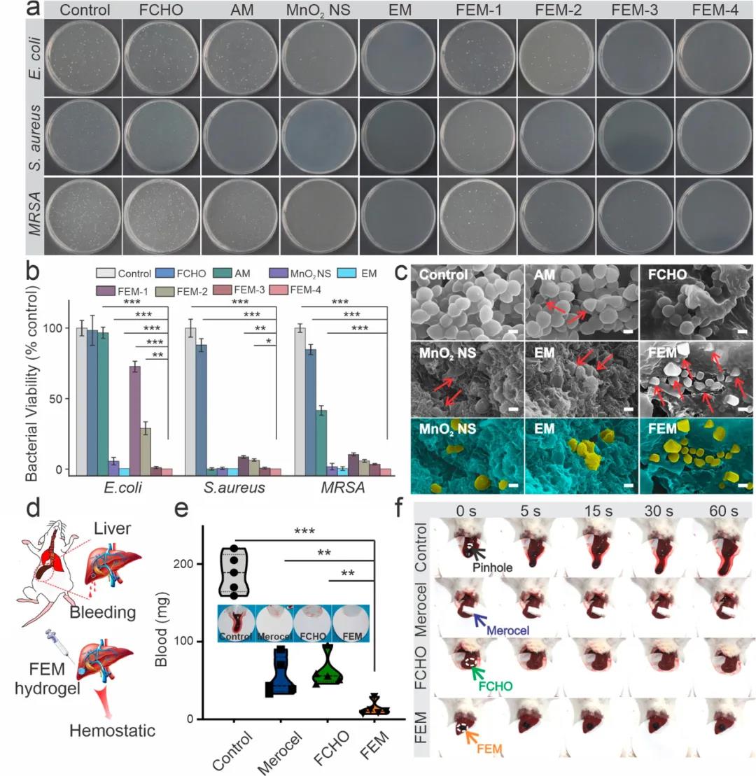 3. FEM水凝膠的抗菌性能FEM水凝膠的抗菌行為的體外評價結果表明:與PBS和抗生素氨芐西林相比,FEM水凝膠對金黃色葡萄球菌,大腸桿菌和MRSA表現出更優異的抗菌能力。此外,隨著FEM水凝膠中包被二氧化錳片含量的增加,抗菌作用顯著增強,其中FEM-4組表現出最出色的抗菌能力,細菌菌落幾乎減少了100%(圖4 a)。使用小鼠出血性肝模型評估了FEM水凝膠的止血能力(圖4 d)。與空白對照組相比,FEM組的失血量顯著減少(圖4e,f)。FEM水凝膠的快速止血性能可能歸因于較短的膠凝時間和強的組織粘合性。此外,水凝膠表面的帶正電荷的氨基還可以通過靜電相互作用與血細胞緊密結合,從而吸收細胞,激活血凝塊的形成。
