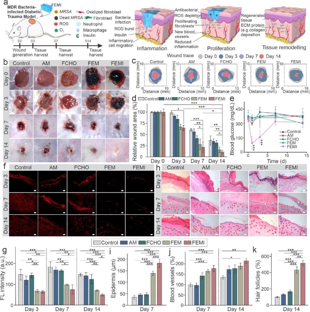 4. GelTA-Alla敷料的傷口模型評價將水凝膠直接注射到小鼠背部產生的傷口中。與第3天的對照組相比,FEM和FEMI(負載胰島素)水凝膠組均顯示出最有效的殺菌作用。在持續的傷口愈合實驗中,用FEM和FEMI處理的小鼠的傷口顯示出明顯加速的傷口閉合。敷有FEMI水凝膠的傷口在第14天愈合得最好(剩余11.70%),基本上被新形成的皮膚覆蓋(圖5b–d)。