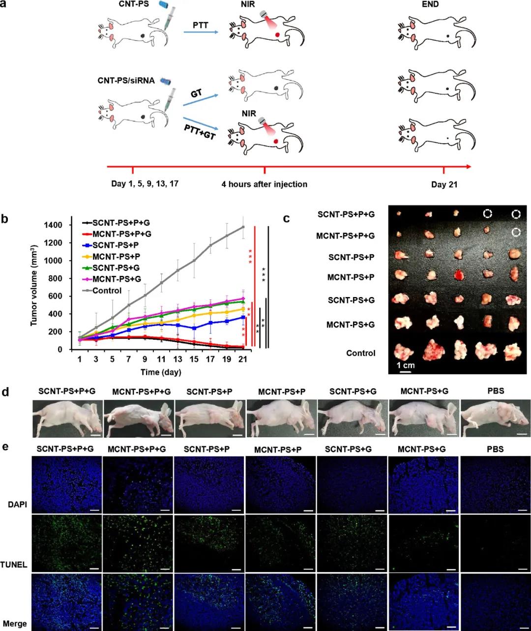2)CNT/siRNA通過抑制survivin表達(dá)抑制腫瘤生長,同時在近紅外(NIR)光下表現(xiàn)出光熱效應(yīng)。SCNT-PS/siRNA具有很高的抗腫瘤活性,對某些腫瘤具有完全抑制作用。由于PL和SL涂層的作用,溫敏的脂質(zhì)發(fā)生了相變,這使得siRNA能夠高效地全身遞送到腫瘤部位,并有助于siRNA的釋放。