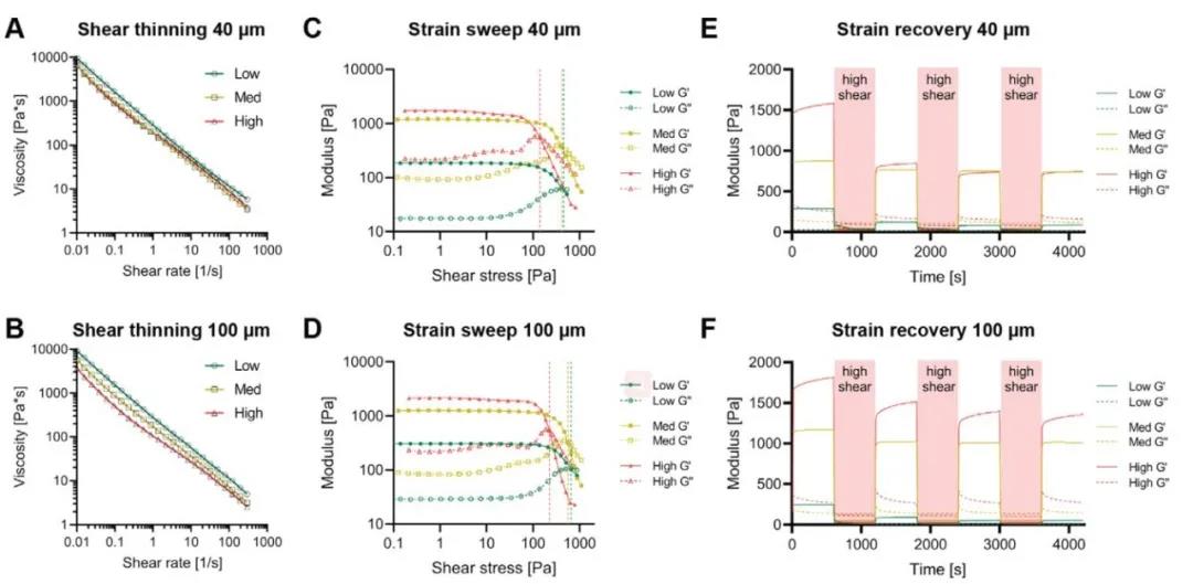 纏結微束型凝膠表現出剪切變稀的流變學特性,這是擠出式3D生物打印所必需的。通過流變學測定,不同交聯強度的HA-MA微束型凝膠的剪切恢復率不同,且隨著篩網孔徑的不同而改變,通過比對,研究者指出中等交聯強度的纏結微束型凝膠樣在初始剪切后的剪切恢復率為81.8% (篩網孔徑40 μm)和82% (篩網孔徑100 μm),明顯優于其他兩組,可作為優良的3D打印生物墨水(圖3)。