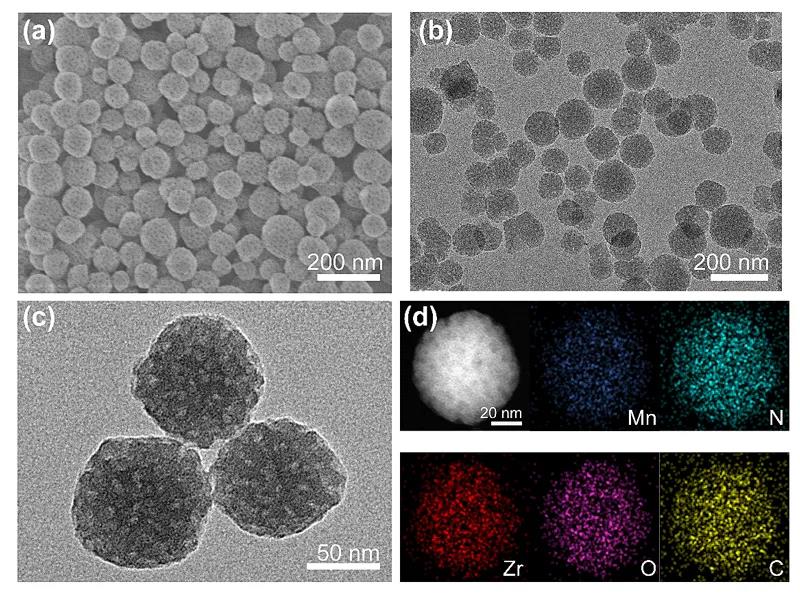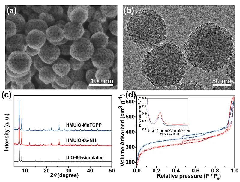 作者使用掃描電鏡、透射電鏡、氮氣吸附測試和掃描透射電子顯微鏡等手段對材料進行了詳細的表征。結果表明該材料介孔尺寸約為7.4 nm,粒徑約100 nm(圖2),且在摻雜卟啉配體之后形貌及結構沒有發生明顯的變化(圖3)。