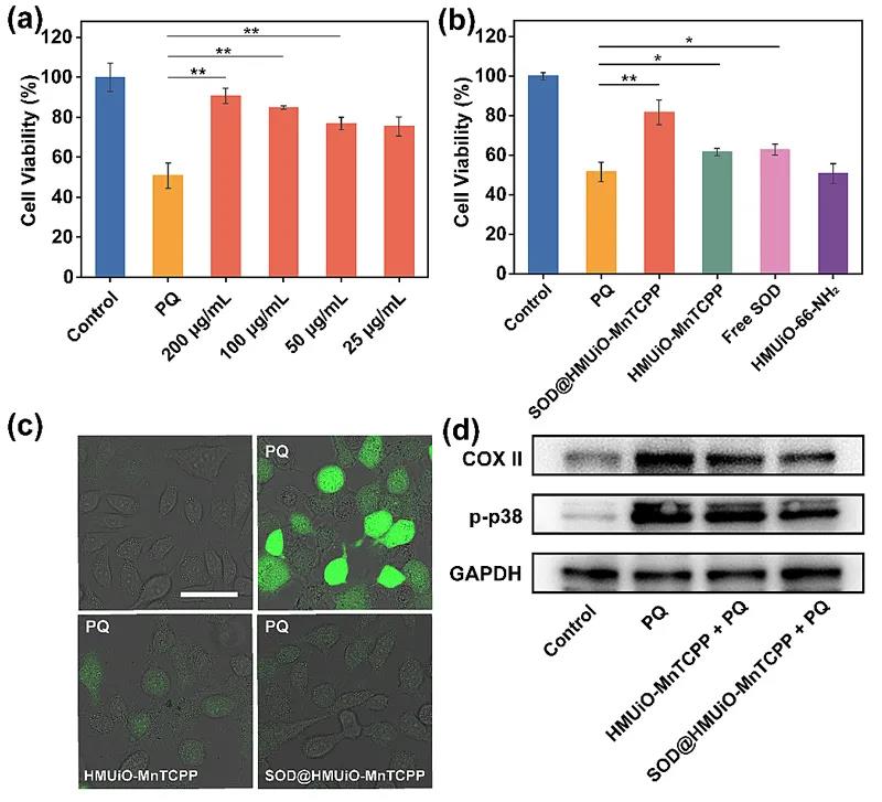 隨后,該團隊采用百草枯(PQ)作為氧化應激源來刺激HeLa細胞內ROS的過表達,以此為模型檢測該抗氧化系統對細胞的保護能力。如圖5a和5b所示,SOD@HMUiO-MnTCPP對細胞活力的影響與劑量呈正相關。同時,與未處理細胞相比,HMUiO-MnTCPP和游離SOD處理組的細胞存活率僅略有增加。表明了SOD@HMUiO-MnTCPP中天然SOD和模擬CAT酶對ROS清除的協同作用,使該納米系統具有更顯著的抗氧化保護水平。為進一步監測不同MOFs處理后細胞中ROS的含量,采用2’,7’-二氯熒光素二乙酸(DCFH-DA)法進行測試。經PQ預處理過的HeLa細胞可在激光共焦掃描顯微鏡(CLSM)成像中產生顯著熒光增強,與細胞內高水平的ROS相對應(圖5c)。而經SOD@HMUiO-MnTCPP預處理過的細胞內熒光明顯減弱,進一步證明該系統對ROS突出的清除能力。此外,因氧化應激產生的p-p38和COX-II被選作生物標記物進一步評價該納米體系的抗氧化能力。Western Blot結果表明,在SOD@HMUiO-MnTCPP治療組中,細胞內p-p38和COX II的表達水平顯著減少,再次說明所設計合成的功能化生物反應器具有清除細胞內O2-和H2O2的能力,能有效地保護細胞免受氧化損傷(圖5d)。
