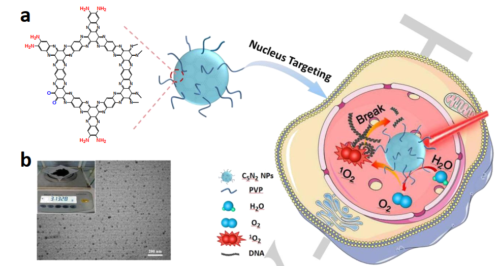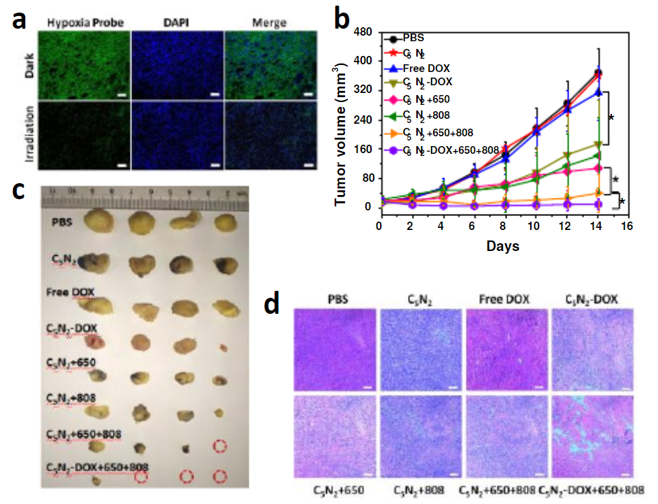 本文要點:(1)實驗通過一步法制備了克級C5N2納米顆粒(NPs)基有機半導體。在650 nm激光照射下,該半導體可裂解水以生成O2,并同時產生單態氧(1O2),表明在該有機半導體中可以同時作為生成O2的光催化劑和產生1O2的光敏劑(PS)。