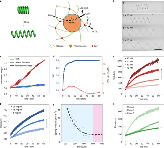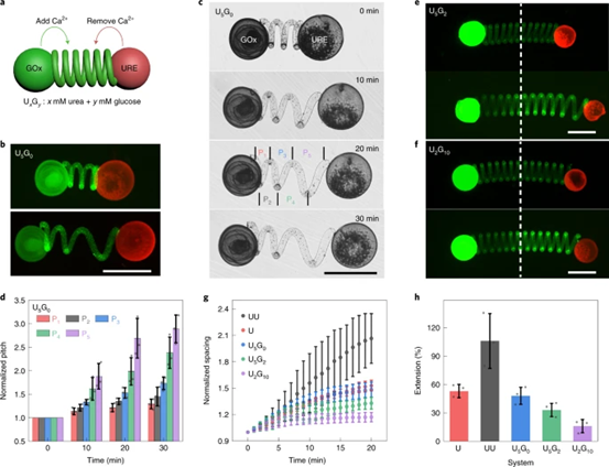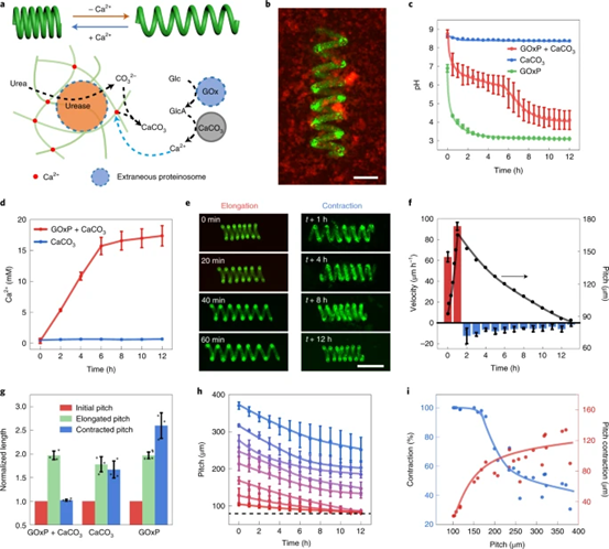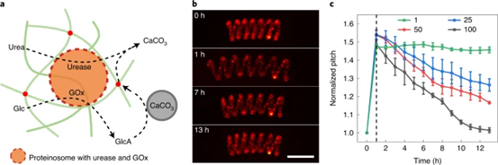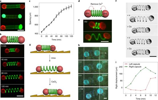 人工細(xì)胞樣群落參與多種化學(xué)相互作用模式,但與當(dāng)?shù)丨h(huán)境的接觸極少。最近,英國(guó)布里斯托大學(xué)Mei Li博士/Stephen Mann院士團(tuán)隊(duì)開發(fā)了一種交互式微系統(tǒng),該系統(tǒng)基于將一群酶活性半透性蛋白體固定在螺旋水凝膠絲內(nèi),以實(shí)現(xiàn)信號(hào)誘導(dǎo)運(yùn)動(dòng)。
