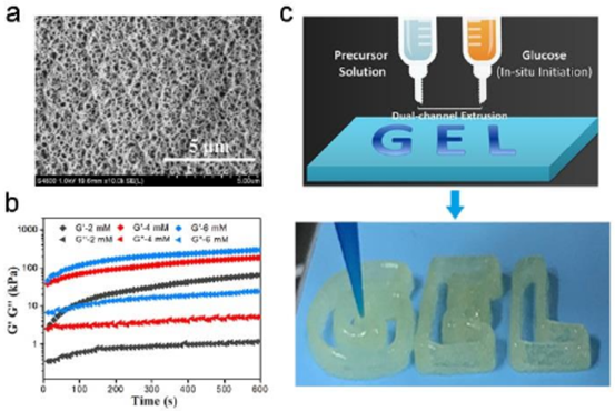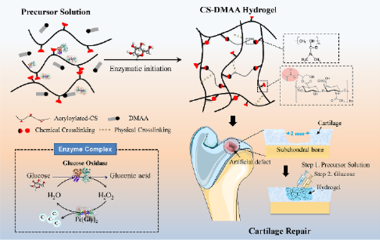 摘要可注射前體的原位凝膠化在組織再生領域是可取的,尤其是在不規則缺陷填充的情況下。當前快速凝膠化的驅動力包括熱敏共聚物的相變、與組織成分的點擊化學反應和金屬配位效應。然而,快速形成堅韌的水凝膠仍然是一個挑戰。受有氧代謝的啟發,同濟大學王啟剛教授團隊提出了一種由葡萄糖氧化酶和甘氨酸亞鐵催化的組織液觸發的級聯酶聚合過程,用于丙烯酰化硫酸軟骨素和丙烯酰胺的超快速凝膠化。