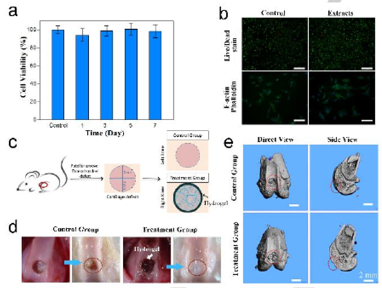 圖4 (a) 在水凝膠提取物中培養的軟骨細胞的細胞活力超過7天。(b)在 Dulbecco s Modified Eagle 培養基和水凝膠提取物中培養的活/死和 F-肌動蛋白鬼筆環肽染色的軟骨細胞的熒光圖像。(c) 使用水凝膠進行軟骨修復的動物實驗示意圖。(d) 對照組和治療組治療前后髕骨照片。(e) 對照組和治療組髕骨修復后的顯微CT圖像。