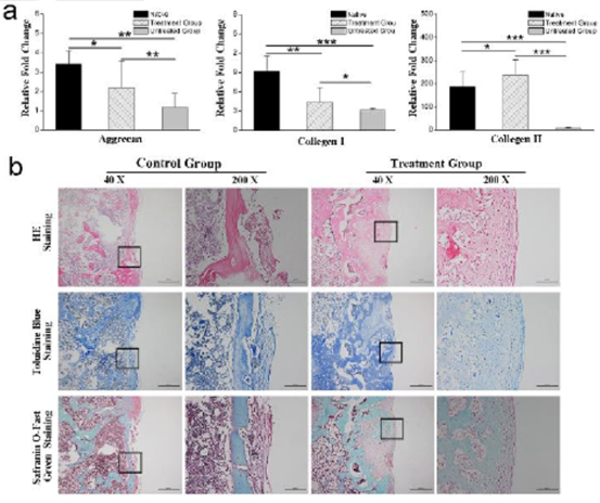 圖5 (a) 蛋白聚糖、膠原蛋白 I 和膠原蛋白 II 的基因表達。(b) HE染色、甲苯胺藍染色和番紅O染色觀察的組織切片。
