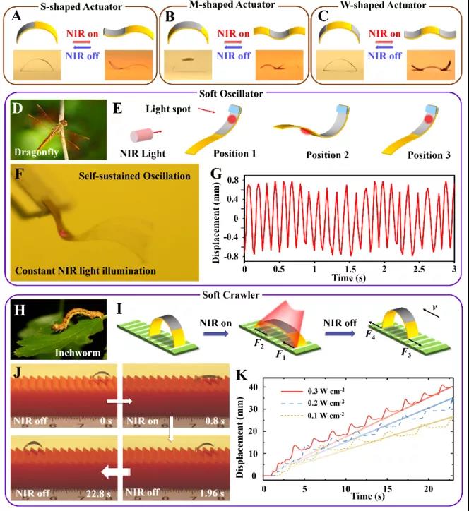 LM-LCN致動器在NIR驅動下的形狀變形和時間編程功能歸因于嵌入式MiniGNR-COOH的卓越光熱轉換效率和膠體LM墨水的選擇性涂層特性。通過將膠體LM墨水涂覆到傾斜排列的LCN薄膜平面側的選定區域上可實現LM-LCN制動器的可編程變形能力(如圖2)。納米結構膠體LM涂層僅沉積在LCN膜的一側、中間部位和兩端時,在NIR光照射下能夠分別獲得可逆的S形、M形和W形驅動。研究人員在自然界中的振蕩現象如蜻蜓的翅膀中汲取靈感后,通過將膠體LM涂層沉積在LCN薄膜的一側,基于光熱和光彎曲變形導致的自陰影機制開發了頻率約為8.0 Hz的NIR光燃料LM-LCN自持軟振蕩器。研究人員進一步仿生自然界中尺蠖爬行,在光照打開/關閉的循環中,展示了一種受光驅動軟機器人爬行器,該爬行器由中心圖案LM-LCN在棘輪基板上易位制成。在NIR照射下,LM-LCN致動器前移是因為LCN表面向下彎曲時前后邊緣不同的摩擦力(F1>F2)。關閉NIR后,LCN條帶彈性恢復,前緣承受較大摩擦力(F4>F3)使履帶后部向前移動。此外,研究發現LM-LCN致動器的爬行速度與紅外光照射強度緊密相關,當808 nm紅外光的照射強為0.1、0.2 和 0.3 W cm-2時,LM-LCN致動器爬行的平均速度分別為 1.17、1.51 和 1.75 mm s-1。