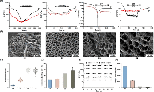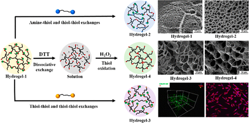 示意圖 2. 基于胺-硫醇/硫醇-硫醇加擾、解偶聯反應和硫醇-二硫化物氧化的各種水凝膠的共價適應性網絡示意圖:(A) PEG 二胺誘導的 H-內化學鍵斷開和重新連接 1 基質通過胺-硫醇和硫醇-硫醇交換生成 H-2,(B) PEG 二硫醇誘導的 H-1 基質內的化學鍵斷開和重新連接通過硫醇-硫醇交換獲得 H-3,以及 (C) DTT 誘導的化學鍵斷開和過氧化氫誘導的重新連接以生成 H-4