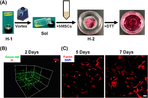 圖 3. 細胞封裝、分布和生長。(A) 示意圖描繪了 H-2 內細胞的誘捕。(B) 共聚焦顯微鏡在 H-2 內封裝后 48 小時封裝的人類間充質干細胞的最大投影。(C) H-2 降解后,將 hMSCs 培養 5 天和 7 天。
