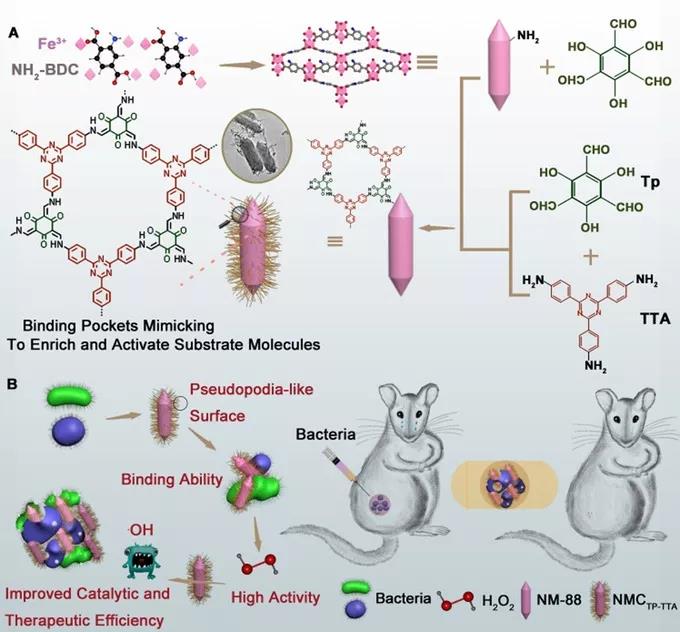 大量研究報道金屬有機框架(MOF)結構具有模擬酶的功能,但由于其類酶催化活性較低,因而使得其在催化性能和治療效果方面不能令人滿意。基于此,中科院長春應化所曲曉剛研究員和任勁松研究員等人2021年在Angewandte Chemie International Edition 上發表了“Nature-Inspired Construction of MOF@COF Nanozyme with Active Sites in Tailored Microenvironment and Pseudopodia-like Surface for Enhanced Bacterial Inhibition”一文,該研究利用源于自然的靈感設計并構建了具有定制微環境活性位點和偽足類表面的MOF@COF納米酶(NMCTP-TTA),從而增強納米酶的催化和治療效率。研究中采用“順序生長”的方法來合成NMCTP-TTA。首先溶劑熱法制備NM-88并通過席夫堿反應形成NM-88-CHO,接著COF共價連接Tp 和 TTA 構建NM-88-CHO,最后將連接到NM-88-CHO上形成NMCTP-TTA。所得到的納米粒子在活性位點周圍形成特定的微孔環境,通過非共價相互作用富集和激活底物分子,這種樹杈狀結構納米酶可以如同中性粒細胞“偽足”樣捕獲細菌并產生ROS有效地殺死細菌。