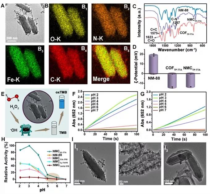 研究人員用具有過氧化物酶樣活性NH2-MIL-88B(Fe)(NM-88)作為模型納米酶,通過席夫堿反應形成醛功能化的納米酶NM-88-CHO。用TP和TTA共價連接COF構建表面COFTP-TT。最后通過溶劑熱法將COFTP-TTA和NM-88-CHO以共價連接方式形成MOF@COF納米酶。SEM,EDS,FTIR表明MOF@COF納米酶的成功制備(圖1 A,B,C,I);COF Tp-TTA、NM-88 和 NMC Tp-TTA ζ 電位 (圖1D);不同PH條件下NMC Tp-TTA和 NM-88的類過氧化物酶活性(圖1F,G)。研究人員觀察到與NM-88相比,MOF@COF的過氧化物酶樣活性明顯提高,并且僅COFTp-TTA無法催化TMB的氧化。因此,MOF@COF的增強催化能力可能歸因于其在COFTp-TTA的組成和結構方面的優勢以及在周圍微環境提供活性位點模仿氨基酸殘基的功能,激活與底物的催化反應,從而增強催化能力。掃描電鏡和透射電鏡觀察到MOF@COF具有“偽足”形態和多孔結構。