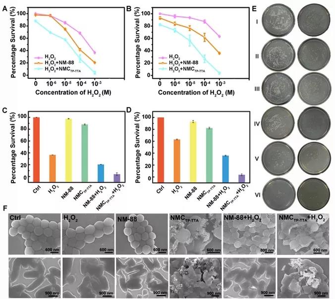 圖2,在不同處理條件下與H2O2共孵育后金黃色葡萄球菌(A)和大腸桿菌(B)的存活率;不同處理后金黃色葡萄球菌(C)和(D)大腸桿菌的存活率;E)不同處理對金黃色葡萄球菌(左)和大腸桿菌(右)的菌落照片,(I)PBS,(II)H2O2,(III)NM-88,(IV)NMCTp-TTA,(V)NM-88 + H2O2,(VI)NMCTp-TTA+ H2O2;(F)金黃色葡萄球菌和大腸桿菌的SEM圖像。