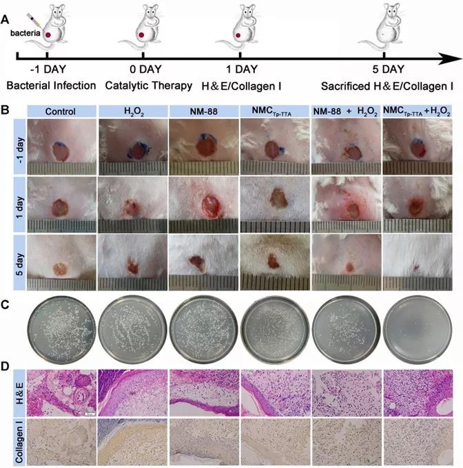 接下來進一步研究MOF@COF的體內應用。通過采用小鼠傷口感染模型,探索了它們在體內消除細菌的潛力。研究人員構建金黃色葡萄球菌感染傷口模型,采用不同治療方式。實驗結果表明,NMCTp-TTA+ H2O2組中出現輕度炎癥和一些膠原蛋白形成,平板計數定量分析發現NMCTp-TTA+ H2O2組的菌落最少(圖3 C,D)。治療5天后,NMCTp-TTA+ H2O2組表現出最佳的傷口愈合效果,且傷口面積最。▓D3 B)。因此可以得出結論,COFTp-TTA可以增強NM-88納米酶的催化和治療性能,并表現出令人欣慰的抗菌效果。